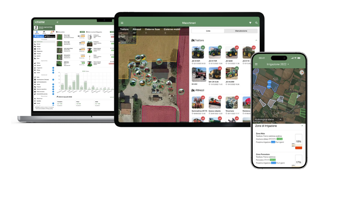 Permette di tenere sotto controllo costi e ricavi per campo e coltura, gestire il magazzino degli input, tracciare la manutenzione delle attrezzature e organizzare il lavoro del personale.