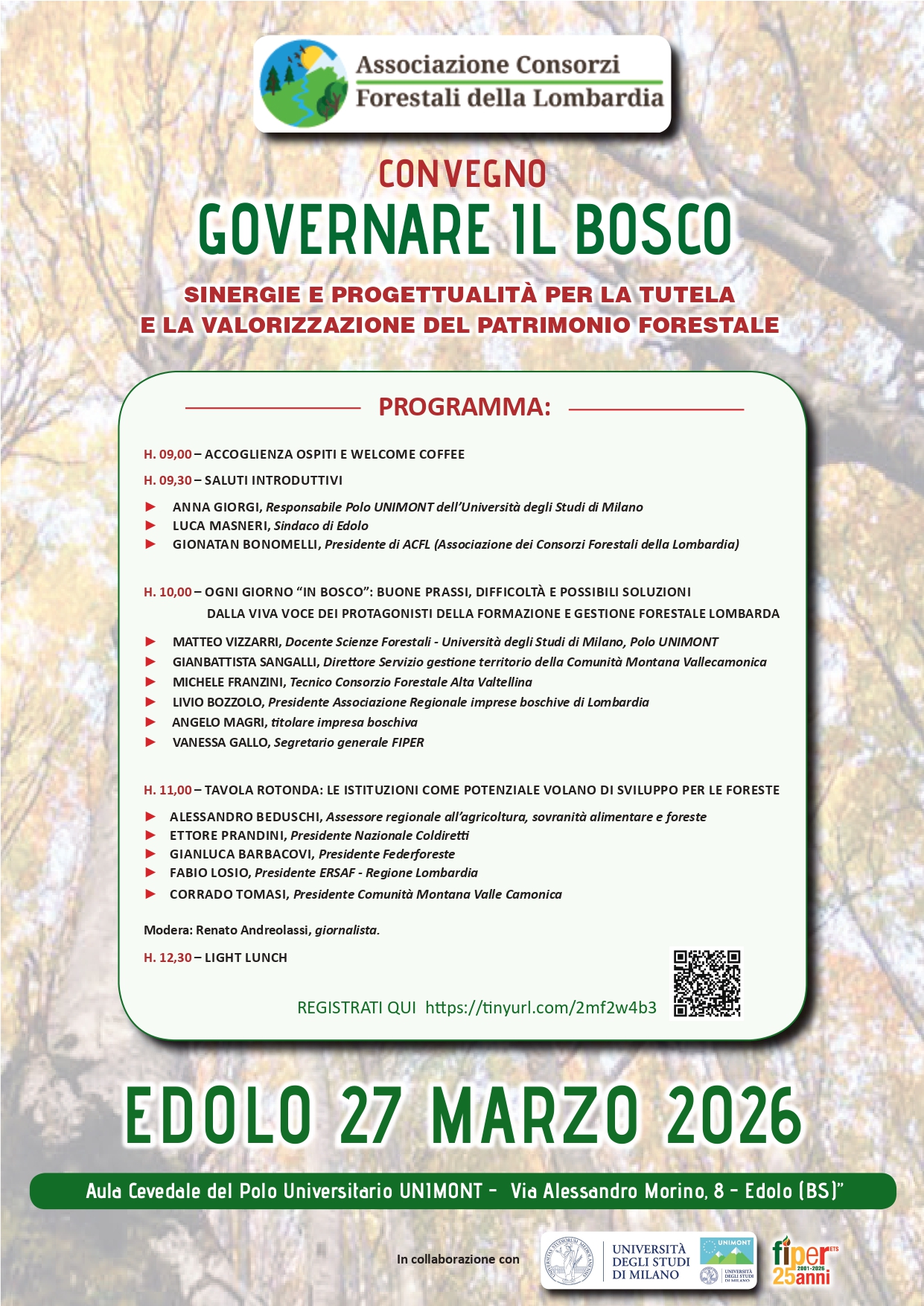 "Sinergie e progettualità per la tutela e la valorizzazione del patrimonio forestale". Convegno organizzato dall'Associazione Consorzi Forestali della Lombardia, in collaborazione con il Polo UNIMONT dell’Università degli Studi di Milano e FIPER.
