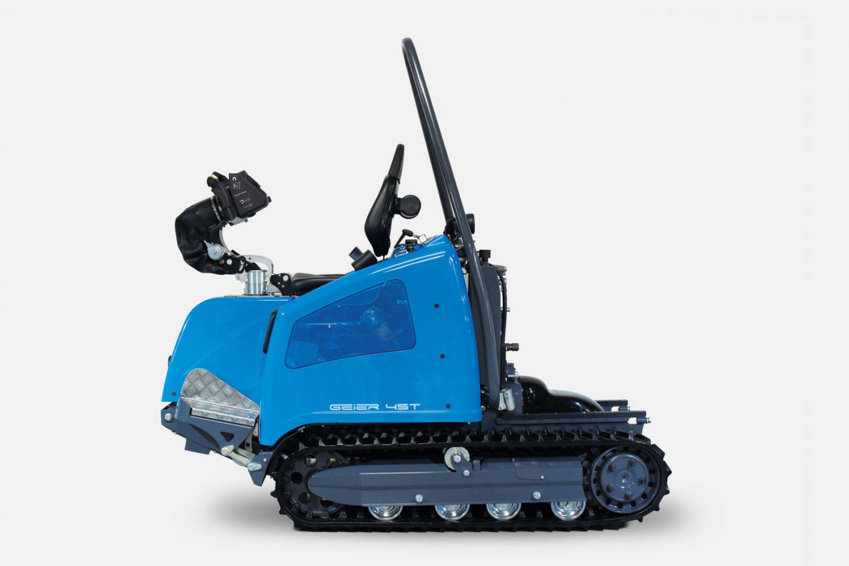 La costruzione compatta e ribassata, nonché il telaio ammortizzato e le ruote motrici con doppia ruota portante offrono al guidatore comfort e trazione ottimale. Ulteriori caratteristiche inconfondibili dei mezzi cingolati Geier sono le larghezze comprese tra 70 e 110 cm soltanto e la massima potenza da 40 a 85 cavalli. Inoltre, il veicolo cingolato, nato come veicolo di trasporto, può essere equipaggiato con 20 differenti dispositivi per eseguire diversi lavori come trattare, trinciare, cimare o defogliare. Grazie al semplice meccanismo a innesto, il montaggio e lo smontaggio di questi attrezzi è comodo e rapido.