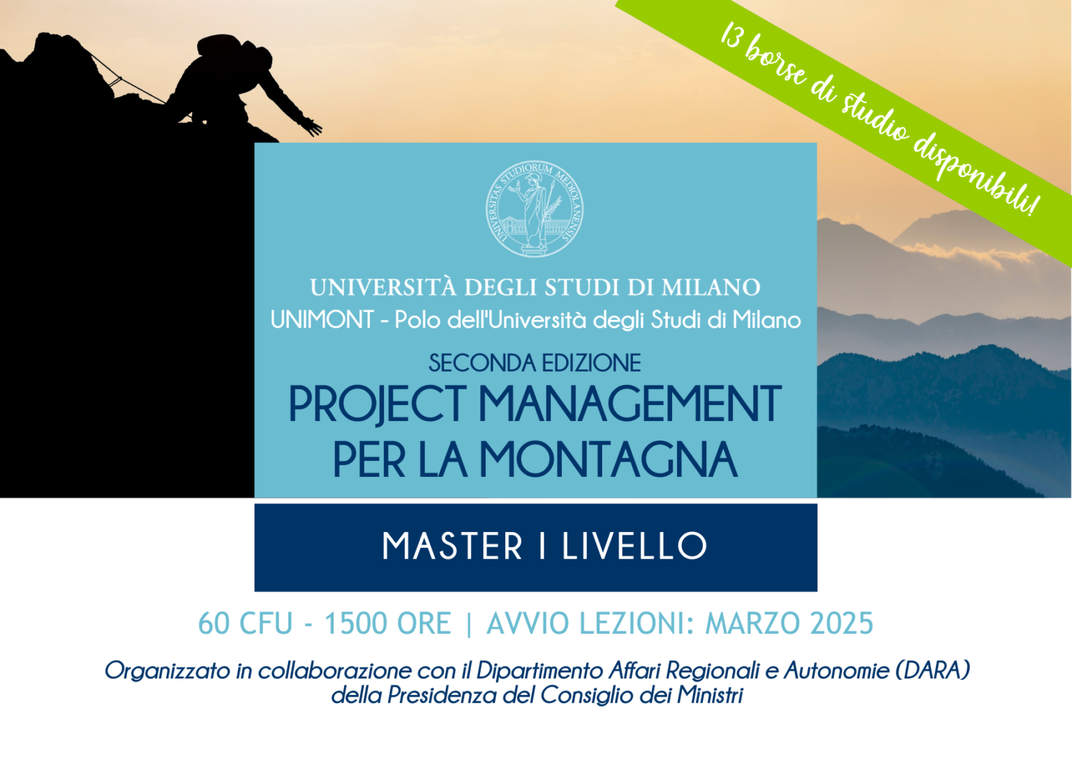Il Master in Project Management per la Montagna erogato dal Polo UNIMONT dell'Università degli Studi di Milano offre competenze nella gestione dei fondi europei e dei progetti per la montagna italiana. Si articola in 1.500 ore totali con lezioni, laboratori e tirocinio.