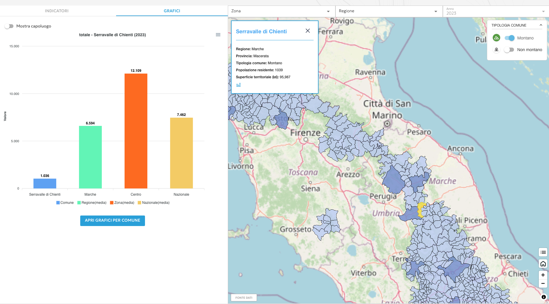 Mappa interattiva che visualizza gli indicatori socio-economici dei comuni montani italiani.